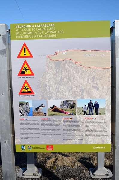 Inzwischen gibt es auch in Látrabjarg Schilder mit Sicherheitshinweisen und in den letzten Jahren wurde dort auch im Gras eine Linie gezogen, die andeuten soll, wie weit man in etwa von der Kante entfernt bleiben sollte.