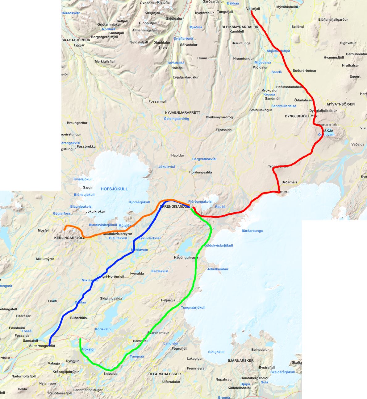 Für die orangene Route solltest du vielleicht den Staudamm am Þjórsárlón mit einplanen. Ab dann gilt es "nur noch" die Þjórsárkvíslar und den Múlajökull zu überqueren. Einen Bericht findest du natürlich (wie immer) auf isafold.de . Alternativ dazu gibt es eine etwas südlicher gelegene Route ab Hreysiskvísl. In der dortigen Nothütte habe ich auch mal einen entsprechenden ziemlich alten Gästebucheintrag von ca. 1988 gefunden, wo es zwei Leute vom Árnarfell her dort hinübergeschafft haben. Gerade sehe ich, dass auf der Karte bei ja.is sogar rot gepunktet ganz grob diese zwei Routen zu finden sind. Musst du natürlich am Ende vor Ort sehen, ob und wie du die Furten angehst.