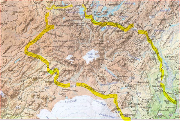 Wenn Du die F210 zurückfahren willst, bliebe eigentlich nur die Hrafntinnusker-Piste als Verbindung von F208 (Landmannalaugar) zur F210.