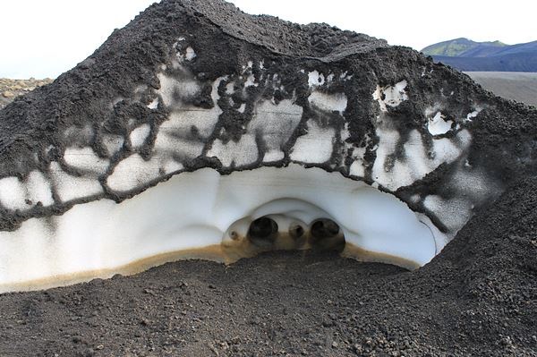 Die Röhren im ersten Bild würde ich einfach "Schmelzwassertunnel" nennen. Bei den Schneeblöcken stimme ich guefz insoweit zu, dass das nicht wirklich nach Gletscher und Eis aussieht, sondern einfach nur nach Schnee vom letzten oder vorletzten Winter. Allerdings scheint mir der schwarze Sand viel zu gleichmäßig verteilt als dass er im Frühjahr draufgeweht worden wäre. Da würde ich dann, je nach Windrichtung, eine dick schwarze Seite und eine blanke Seite erwarten, die dann auch bei mehreren dieser Schneehaufen irgendwie zusammenpassen sollte. Wahrscheinlich passt das Stichwort "Ablationskegel" hier eher...