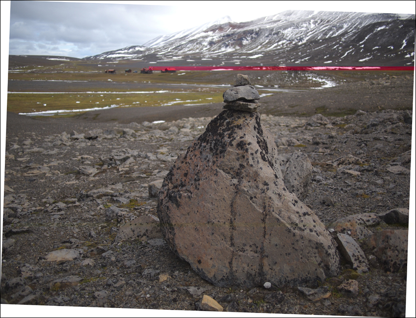 Sie meint: die Route gab es mal durch dieses Lavafeld, ist aber dan später verlegt worden. Auch frage ich ihr nach diesen art von Nebel der heute am fusse des Upptyppingars schwebt, den hier werde ich nach verlassen der Drekaskáli die erste Nacht zelten. Es ist einen mix aus Staub, Sand und Schnee dessen da nun herum fliegt. Schaut also nicht unbedingt attraktiv aus...