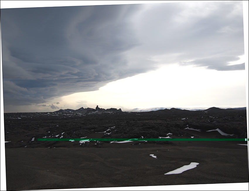Ich sehe kurz unter mich eine Schneedüne und hüpfe wie ein Kangaroo hinein. Der Wind rasst nun über meinen Kopf. Ich muss hier hinunter, und zwar schnellstens (aber nicht zu schnell !). Auch nun kommen die Steigeisen zu nutze. "Mein" schneefeld läuft ununterbrochen bis zum Boden, verliere aber so wieder die Markierungen. Unten am Boden angekommen, erstmal eine Pause. Die Steigeisen können wieder eingepackt werden. Dannach suche ich wieder die Streckenmarkierungen, doch vergeblich. Von einer kleine Anhöhe überblicke ich das raue Lavafeld vor mir, wass nun ? Am rande des Lavafeldes entlang, oder....versuchen dieses Feld zu queren; es ist Blocklava.