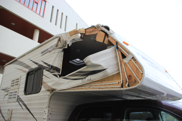 Auf dem Rückweg sind wir leider aufgrund der Unebenheiten im Fahrbahnboden mit dem Camperaufsatz gegen die Felswand geprallt. Ergebnis: