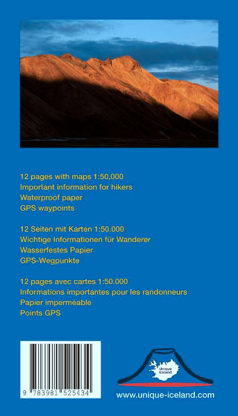 Diese kleine Broschüre ist der perfekte Begleiter auf der Wanderung zwischen Landmannalaugar und Skógar. Sie beinhaltete neben ein paar nützlichen Informationen, sieben Wanderkarten (davon fünf als Doppelseite) im Maßstab 1:50 000. Die Wanderkarte des isländischen Landesvermessungsamtes ist sehr gut zu lesen und mit Hilfe der aufgelisteten GPS-Punkte kann man sich bei schlechter Sicht zur nächsten Hütte navigieren. Die Broschüre ist mit nur etwa 20 Gramm extrem leicht, besitzt mit 12 x 21 cm ein handliches Format und wurde auf wasserfestem Papier gedruckt.