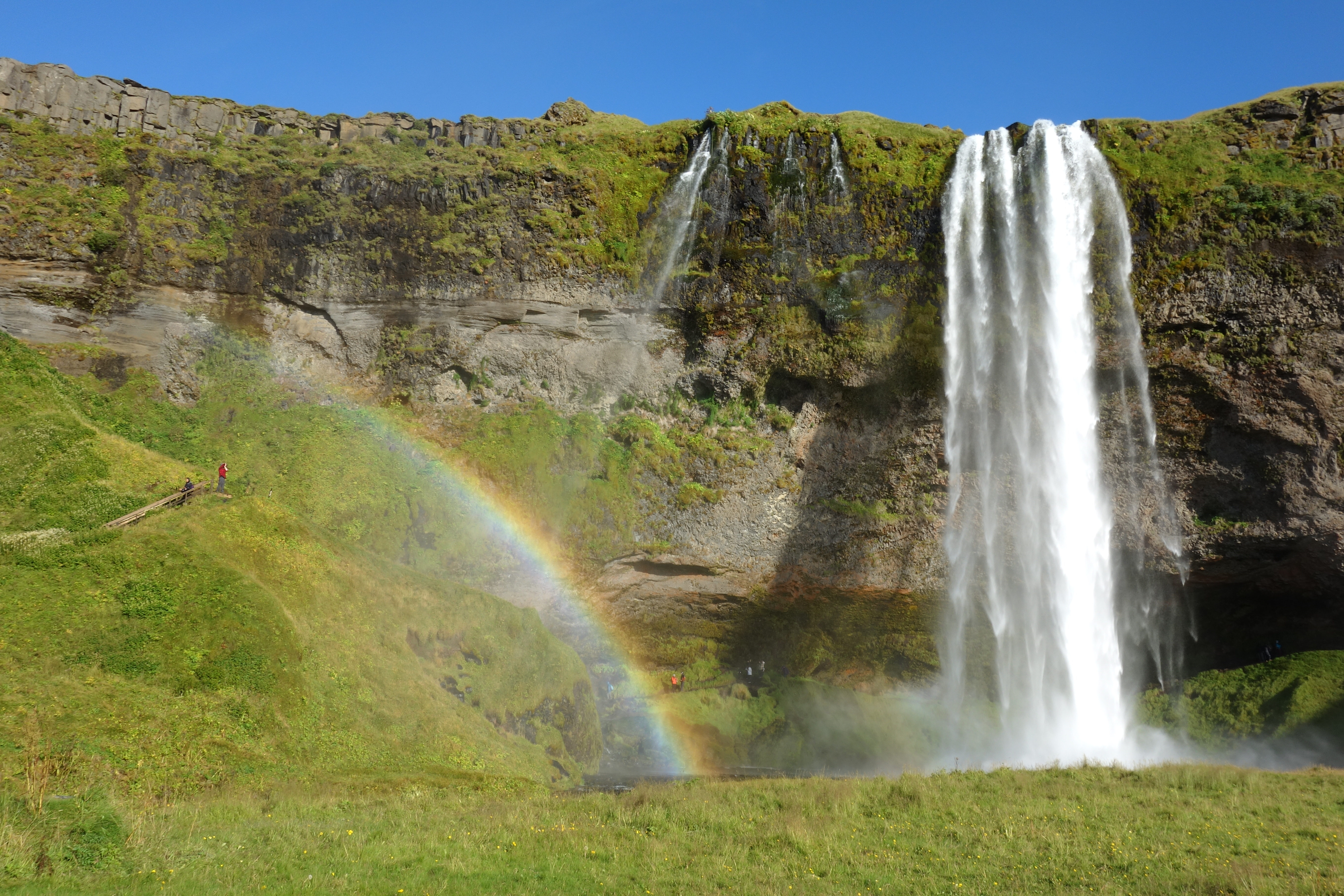 Wir hatten einen Tag halbwegs gutes Wetter und einen Tag Traumwetter, an dem wir uns die Südküste bis Vik angesehen haben. Seljalandsfoss mit Regenbogen und Reynisfjara bei blauem Himmel mit Sonnenschein und so warm, dass man im t-shirt rumlaufen konnte. Das war wirklich unglaublich schön. Gullfoss und Geysir haben wir uns an einem anderen Tag natürlich ebenfalls angesehen, obwohl es mich nicht ganz so beeindruckt hat. Ich fand den Seljalandsfoss und die unzähligen Wasserfälle auf dem Weg nach Vik beeindruckender. Es kann auch daran gelegen haben, dass ich aufgrund meiner Gehbehinderung nur bis dorthin kam, wo eben alle hinkommen und die vielen Selfieknipser und Drohnenpiloten stören die Stimmung dann schon etwas. Allerdings muss ich zu diesen viel beschworenen Tourimassen sagen, dass es sich wirklich in Grenzen hielt, vor allem für jemandem, der aus einem dicht besiedelten deutschen Ballungsgebiet kommt und noch nie in Island war. O.k. diese Busladungen voller Touristen, die gab es natürlich, aber wir haben immer einen guten Parkplatz gefunden, auch am frühen Nachmittag und es war nie so, dass man sich gegenseitg auf die Füße getreten hätte oder vor lauter Menschen keinen Wasserfall mehr gesehen hätte. Sobald man sich ein paar Meter entfernt hatte, waren die Landschaft und die Straßen menschenleer. Wir haben in einem ganz schnuckligen Cafe direkt an der Route 1 Kaffee getrunken und Kuchen gegessen und außer uns waren dort nur noch zwei Biker und eine weitere Familie.