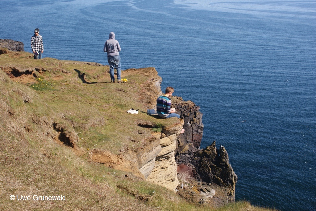Wenn ich richtig recherchiert habe, dann wurde das Video 2015 veröffentlicht. Unten habe ich ein Foto angehangen, welches ich 2011 auf Snæfellsnes gemacht habe. Eine Handvoll Touristen sind an der Steilküste und wirklich alle halten einen kleinen Sicherheitsabstand zur Abrisskante. Dann kam ein junger Isländer, grinste arrogant die Touris an und setzte sich direkt an die Kante, um sein Lunch einzunehmen. Man muss kein Geologe sein, um zu erkennen wie brüchig das Gestein dort ist. Passieren kann natürlich immer und jederzeit etwas, aber es gab, es gibt und es wird auch in Zukunft immer Menschen geben, die es darauf anlegen, sich für den Darwin Award zu bewerben.