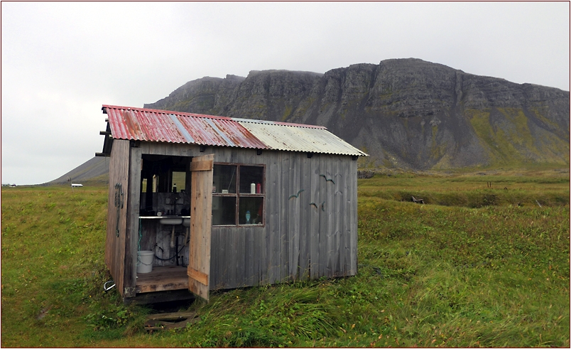 ... schaun wir uns den doch mal näher an, dachte ich mir so. Von hinten her öffnente ich die durch einen Holzbügel verriegelte Tür und fand eine perfekte Toilette vor. Freilich, Spülwasser muss man von der nahen Húsa holen. Ich ging um das kleine Gebäude herum und siehe da, auch nur ein Holzriegel. Ich öffne ihn und finde ein kleines Stübchen mit Küchenecke, einer Bettstelle und sogar einer eingebauten Dusche vor. Trotzdem war vieles hier sehr provisorisch, und die hintere Wand hatte so grosse offene Lücken, dass sie mit einer Folie abgedichtet war. Auf dem Fenstersims lagen verrostete Feuerzeuge und überhaupt, alles schien hier längere Zeit nicht benutzt worden zu sein.
