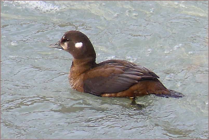 Nach Stunden des Abstiegs habe ich den Gletscherfluß Selá erreicht. Eine Kragenente (Histrionicus histrionicus) folgt mir ein Stück des Wegs auf dem Gletscherfluß. Aber was macht sie hier??? Nach weiteren 2 Stunden erreiche ich endlich die erste Farm bei Laugarholt. Vor der Farm befindet sich ein weiteres Anwesen mit einem kleinen Thermalbad. Den Dampf der Thermalquelle sieht man schon aus der Ferne. Das kleine Bad befindet sich aber auf Privatgelände.