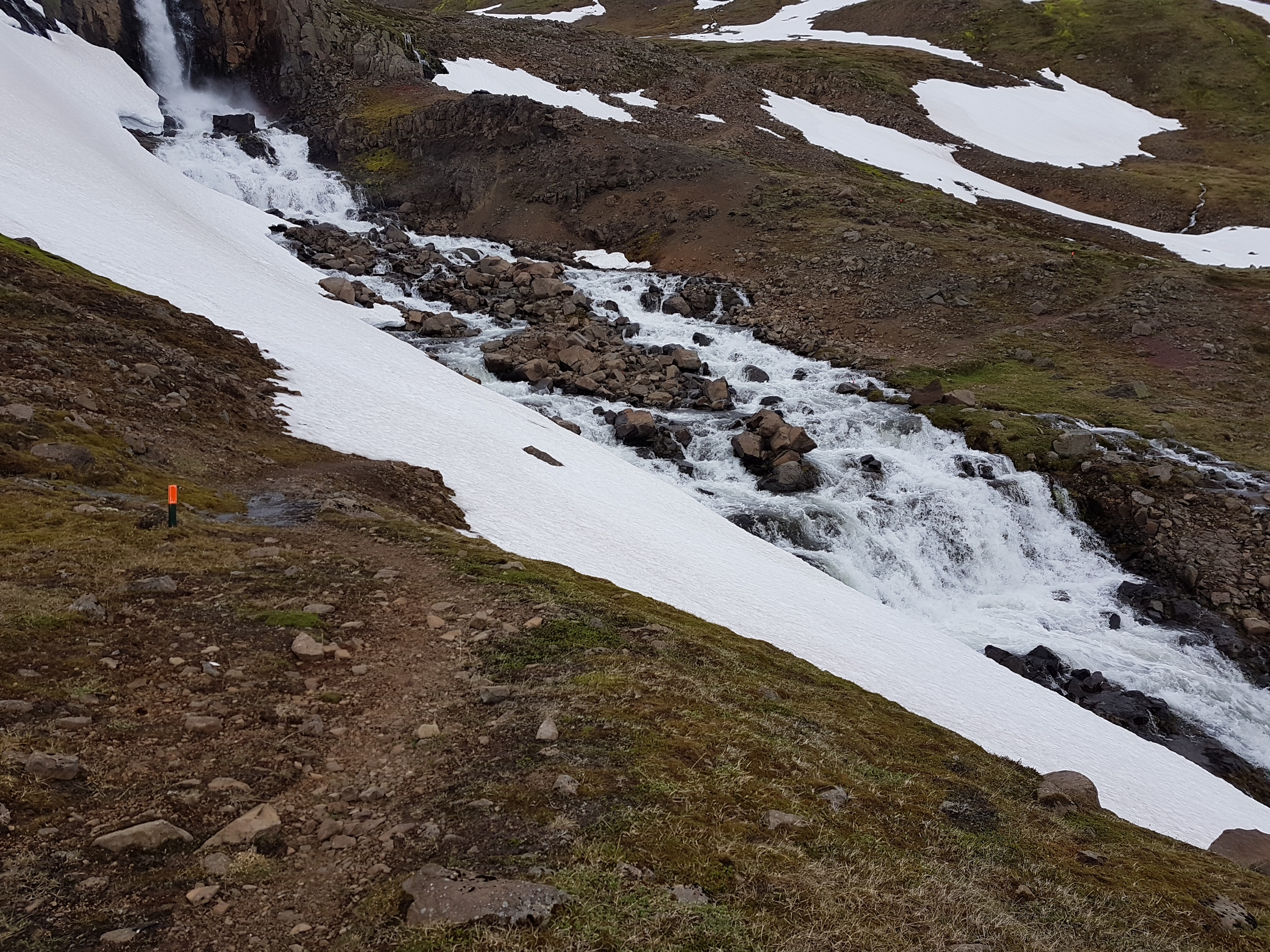 Am nächsten Tag die Puffins angeschaut. Dann wollte ich den direkten Weg zum Storurd. Ich hab einen Wanderer aus Island, der den Weg vor 2 Tagen gekommen ist befragt. Antwort: man kommt schon durch, man muss nur aufpassen, dass man auf den Schneefeldern nicht in die Bäche, die darunter laufen, einbricht. Erst 18:00 wurde das Wetter besser und ich bin gestartet, auf den 622m Pass. Oben war es saukalt und die nächsten km sahen sehr abschreckend aus. also umgedreht, zurück zum Zeltplatz in Bakkagerði.