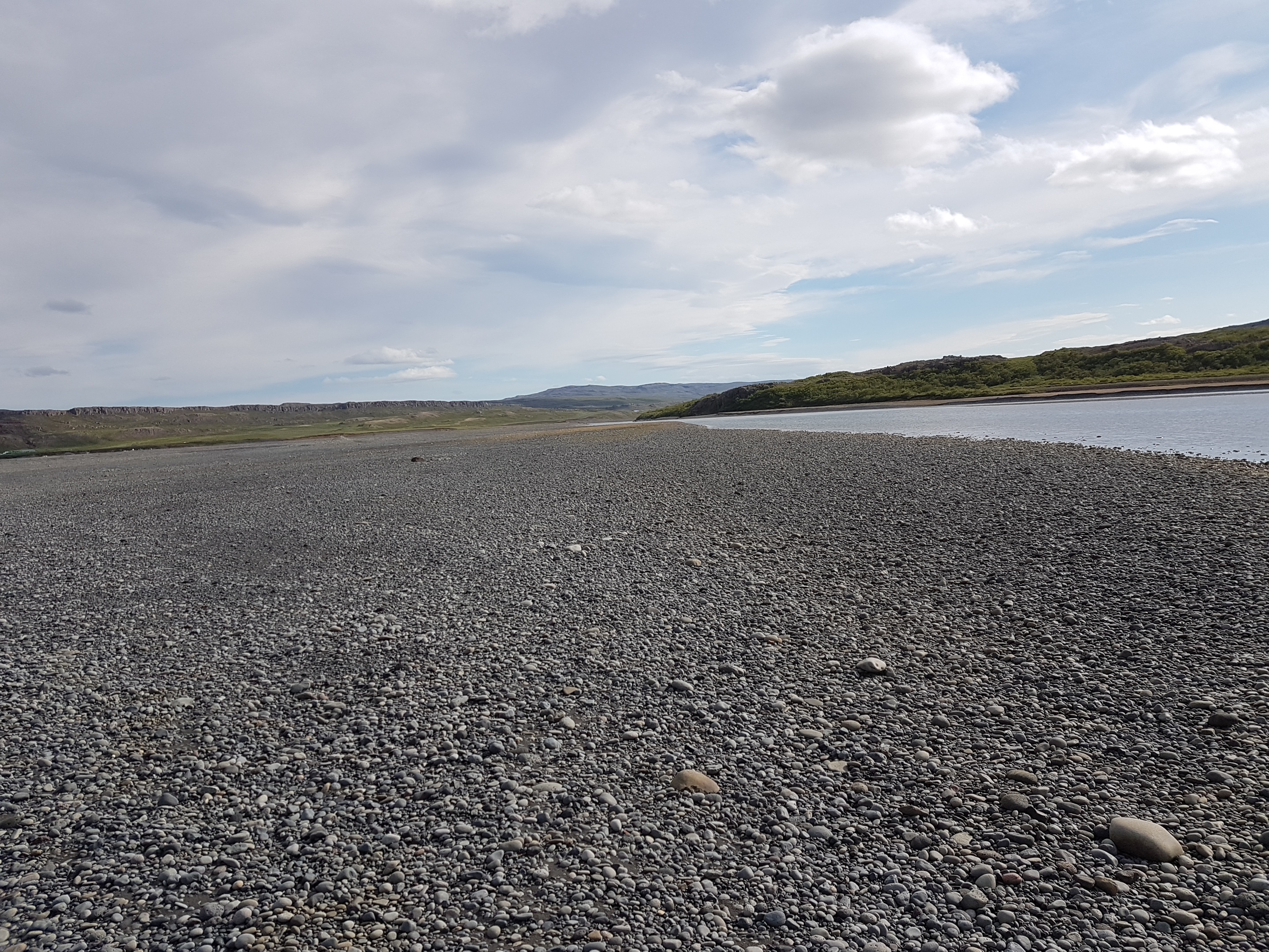 Über Nacht wurde es kalt. Am nächsten Tag hatte der Bach ca. 15 cm weniger Wasser. Ich hab mich am Weg nicht durchgetraut. Ich bin 250 hm aufgestiegen bis im Bachbett eine ebene Stelle war und dort problemlos durchgekommen, dann zum Zeltplatz in Husavik. Der Warden wusste nicht recht was er alles ausfüllen musste, ich war der erste Zeltplatzgast in dieser Woche. Sauwetter war angesagt, so bin ich als es fast nicht regnete 5:30 in der früh aufgebrochen.