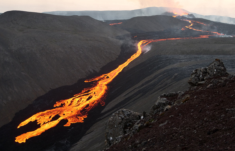 Kommt natürlich auch auf die Windverhältnisse an. Der Langi Hryggur ist aber der beste Punkt um auf den Krater zu sehen da sich die Krateröffnung mit Lava-Ausfluss auf der Ostseite befindet. Momentan läuft die Lava nordöstlich in die Meradalir, nicht mehr in Richtung Natthagi. Die Abflussrichtung kann sich jedoch jederzeit wieder ändern. Es sieht im Moment aber eher nicht danach aus.