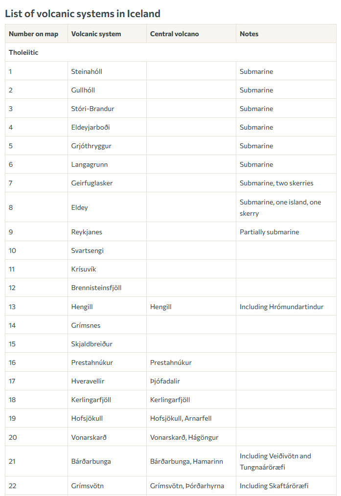 Wer noch ein bisschen weiterlesen möchte: Hier ist der Katalog der isländischen Vulkane: https://icelandicvolcanoes.is/?volcano=REY