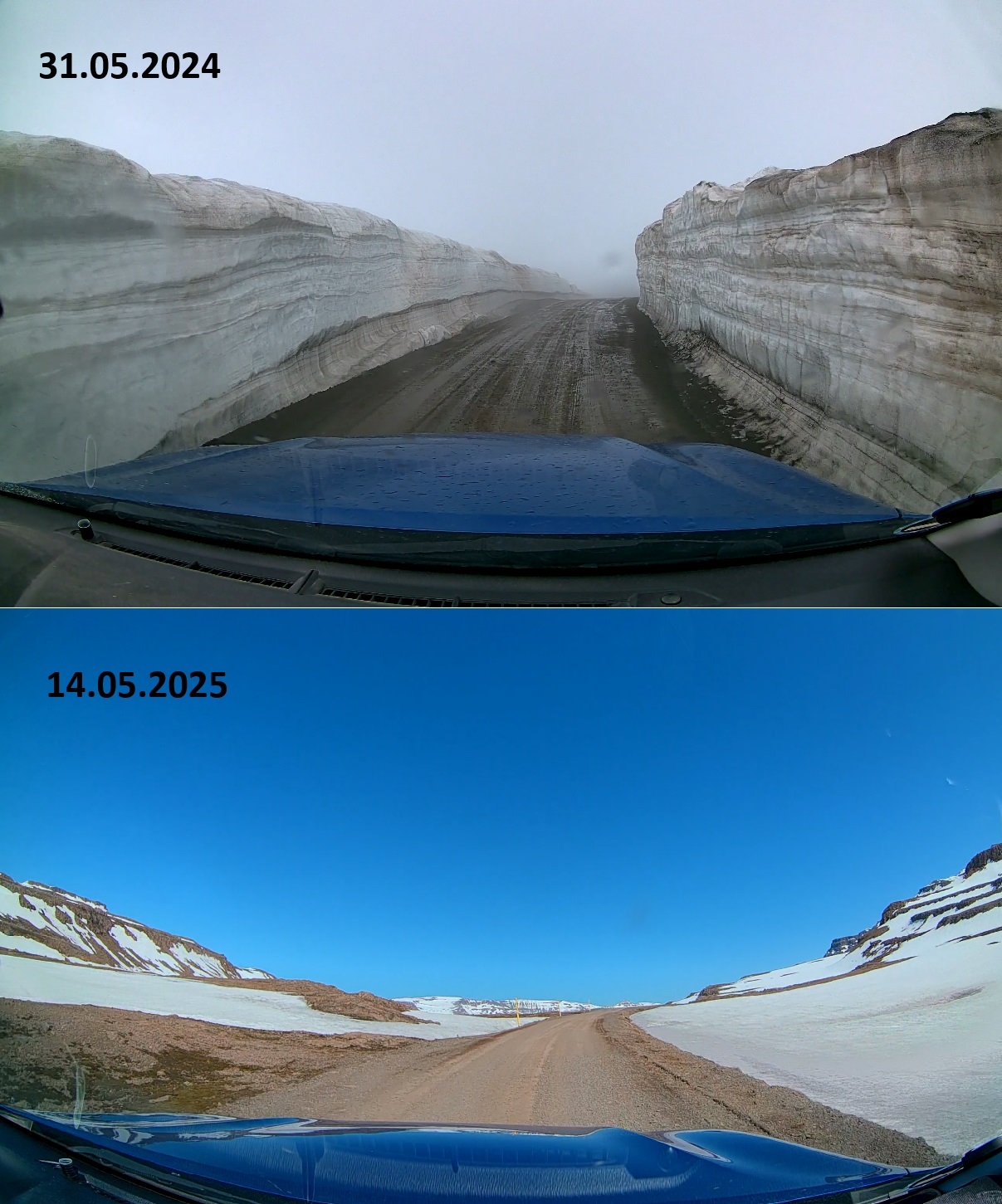 Mai 2024, noch gut Schnee im Norden/Osten Temperaturen bei knapp über 0 Grad (am Tag)