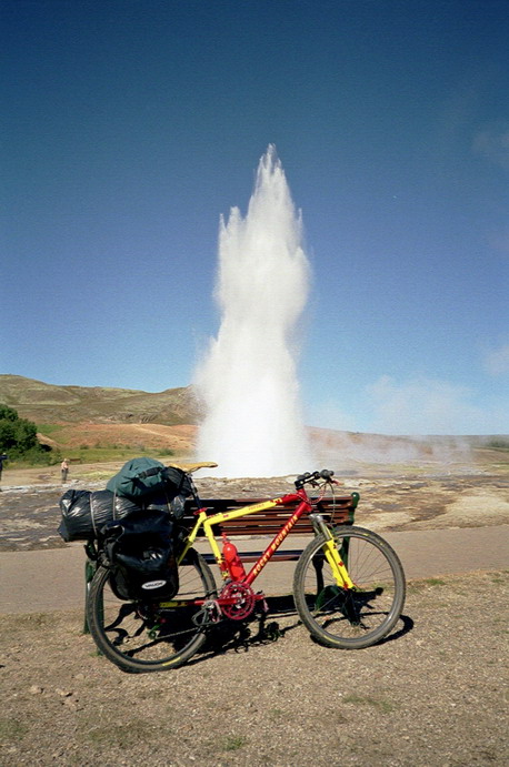 Beispiel für n schönes Island-Bike, n schönes Geysir-Foto und ne schlechte Gewichtsverteilung des 15-kg-Reisegepäcks auf dem ansonsten 10-kg-Rad (waren also ca. 21 kg Achslast auf der Hinterachse und ca. 4 kg Achslast auf der Vorderachse, sprich: das ideale Wheelie-Gefährt 8) )