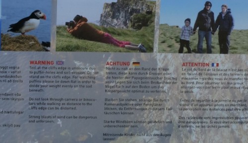 Inzwischen gibt es auch in Látrabjarg Schilder mit Sicherheitshinweisen und in den letzten Jahren wurde dort auch im Gras eine Linie gezogen, die andeuten soll, wie weit man in etwa von der Kante entfernt bleiben sollte.