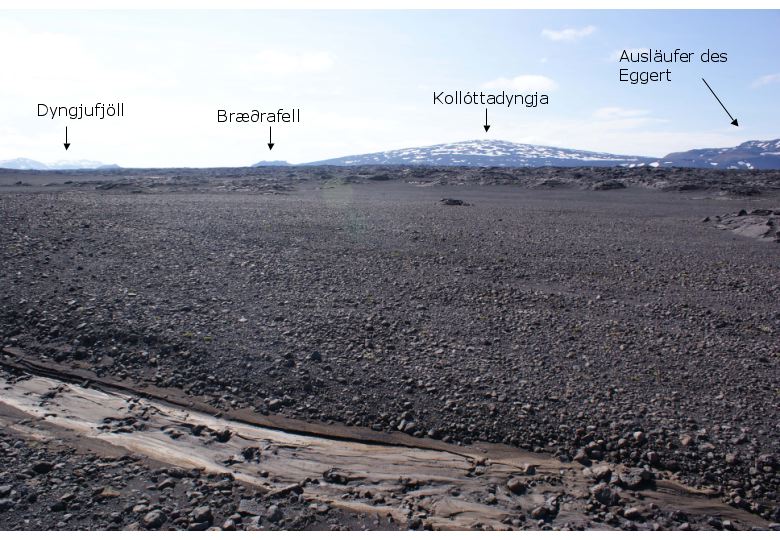 danke für das Photo, welches wirklich gut ist. Leider ist es nicht der Schildvulkan Kollóttadyngja. Bei deinem Photo handelt es sich, wie beim untersten Photo von Andi, um das kleine Eggert Massiv, welches wiederum die südlichen Ausläufer des Her∂ubrei∂arfjöll darstellt. Die Kollóttadyngja ist ein jüngerer Schildvulkan, der sich in direkter südwestlicher Nachbarschaft von Eggert befindet. Auf Andis ersten Photo sind die nördlichen Ausläufer der Kollóttadyngja teilweise noch zu sehen. Der Gipfelbereich wird aber größtenteils vom "Gipfelobelisk" verdeckt.