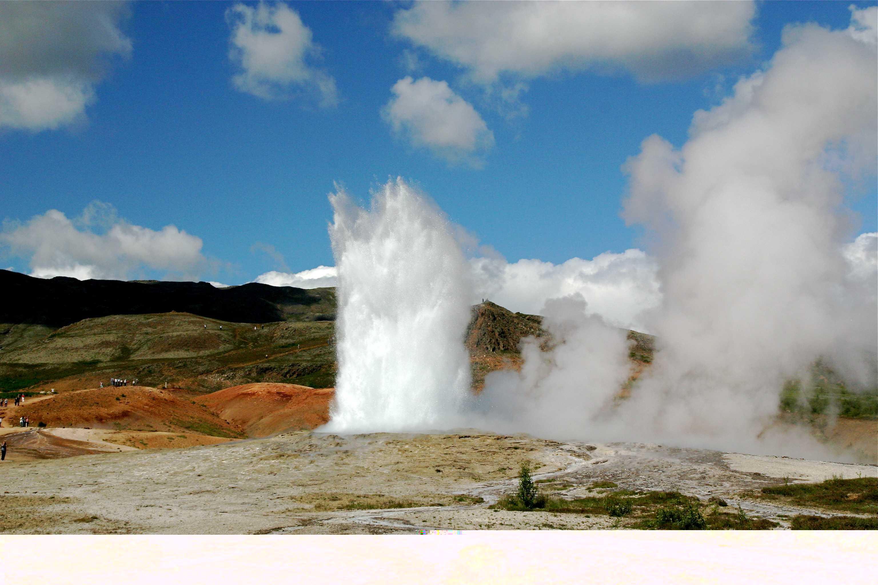 http://de.wikipedia.org/wiki/Gro%C3%9Fer_Geysir hier eine sehr seltene Aufnahme, wo mal beide gleichzeitig aktiv sind. Leider nur aus größerer Distanz vom Eingang aus aufgenommen, also eher ein dokumentarisches Foto: Bei Bea's letzem Bild (weiter oben) bin ich mir nicht sicher, ob das tatsächlich der Geysir ist, der da im Hintergrund zu sehen ist. Ich vermute hier eher, dass im Vordergrund der Strokkur und im Hintergrund die anderen Dampfquellen zu sehen sind. Also eher ein Blick vom Strokkur Richtung Touri-Shop/Hotel. Aber vielleicht täusche ich mich da auch.