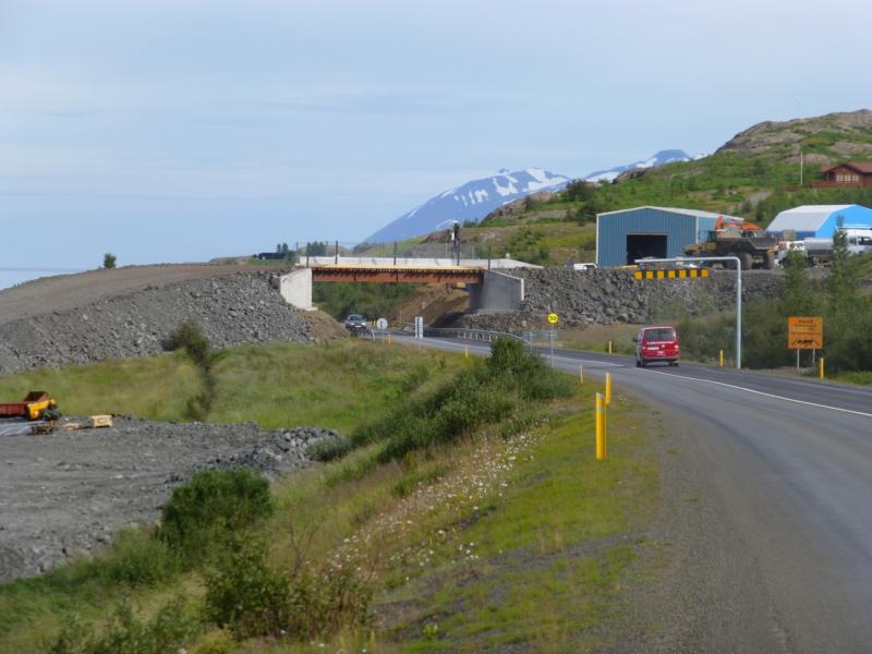 Links gehts über die Brücke zum Tunnel und auf der Straße bleibend unter der Brücke durch nach Grenivik.