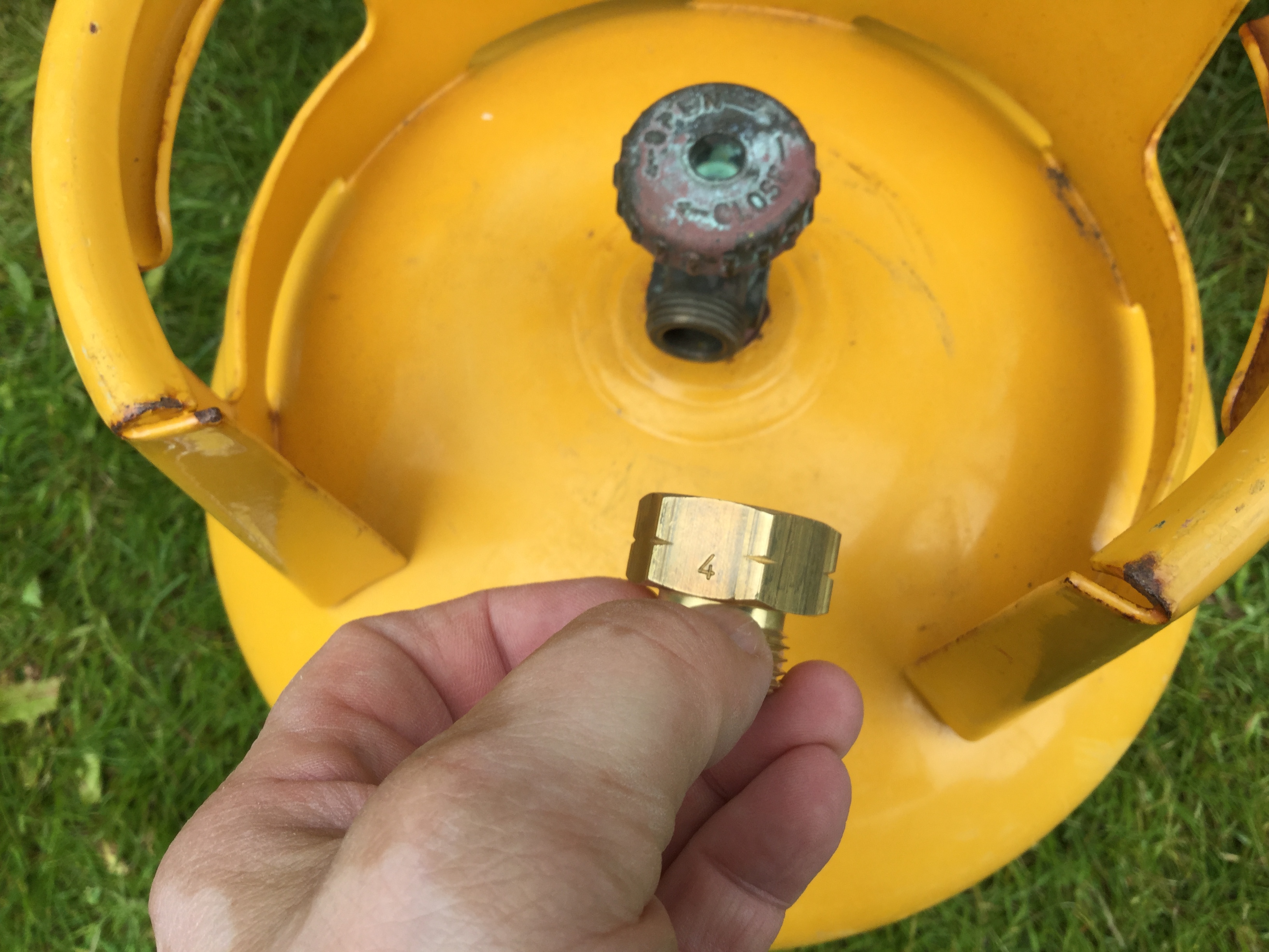 anders ist das bei flaschen mit Clip-on-anschluss. hier brauchst Du einen adapter, der in Island erhältlich ist, den Du aber mit dem in Deinem womo befindlichen anschluss verbinden musst. der isländische sieht etwas anders aus als der auf dem folgenden foto, aber das prinzip ist dasselbe.