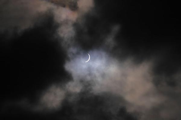 Hier ein Zeitraffer von mir. Der Vorteil mit Wolken ist, dass man den Mondschatten besser sieht, wie er von rechts nach links durchzieht und alles verdunkelt. Eine Korona und "schwarze Sonne" wäre mir zwar lieber gewesen, aber auch das hier war eindrucksvoll und für mich (nach 4 Schönwetter-Sofis) das erste Mal.