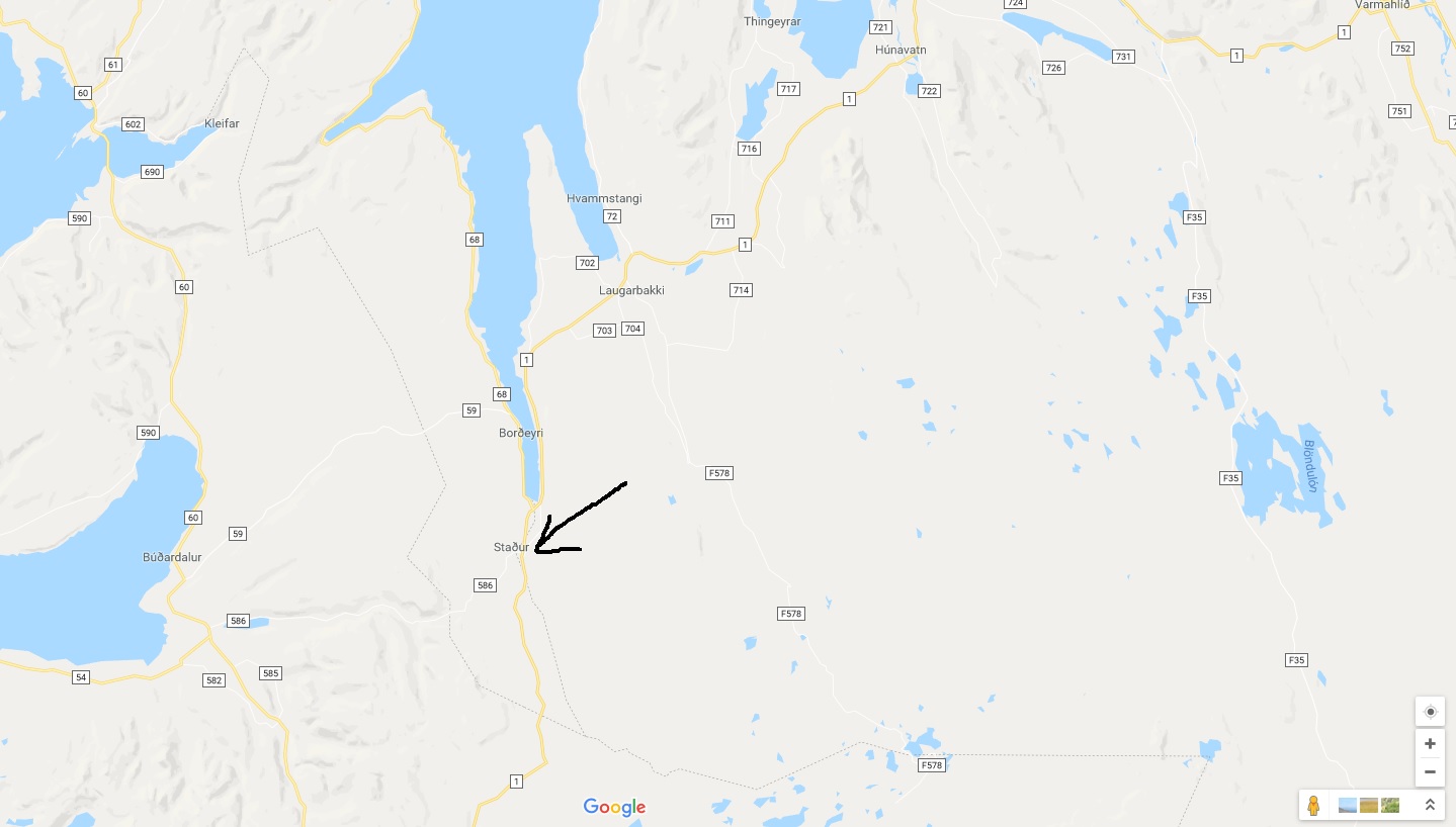 Unabhängig von Staður wäre es vielleicht für euch spannend, euch an der isländischen Karte zu orientieren. Google Maps ist für isländischen Verhältnisse nicht immer hilfreich. Ihr findet die Karte hier: https://en.ja.is/kort/?type=map. Dort lassen sich auch Streckenberechnungen durchführen (Arbeit mit der rechten Maustaste).