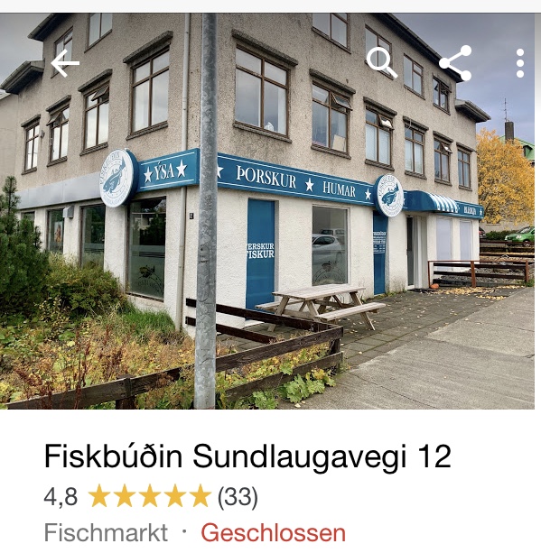 Der von Monique genannte Laden im Sundlaugarvegi lohnt sich, die haben auch ganz klasse schon fertig marinierten oder gewürzten Fisch, was sich gerade lohnt, wenn man unterwegs nicht so viel zum Kochen dabei hat. Am Übergang von Reykjavík nach Seltjarnanes (Nesvegur 100), was ja auch nicht so mega weit vom Schuss ab ist, gerade wenn man Grótta besucht, ist auch ein schöner Fischladen (Vegamót). Im Hauptstadtgebiet gibt es noch mehr Fischläden.