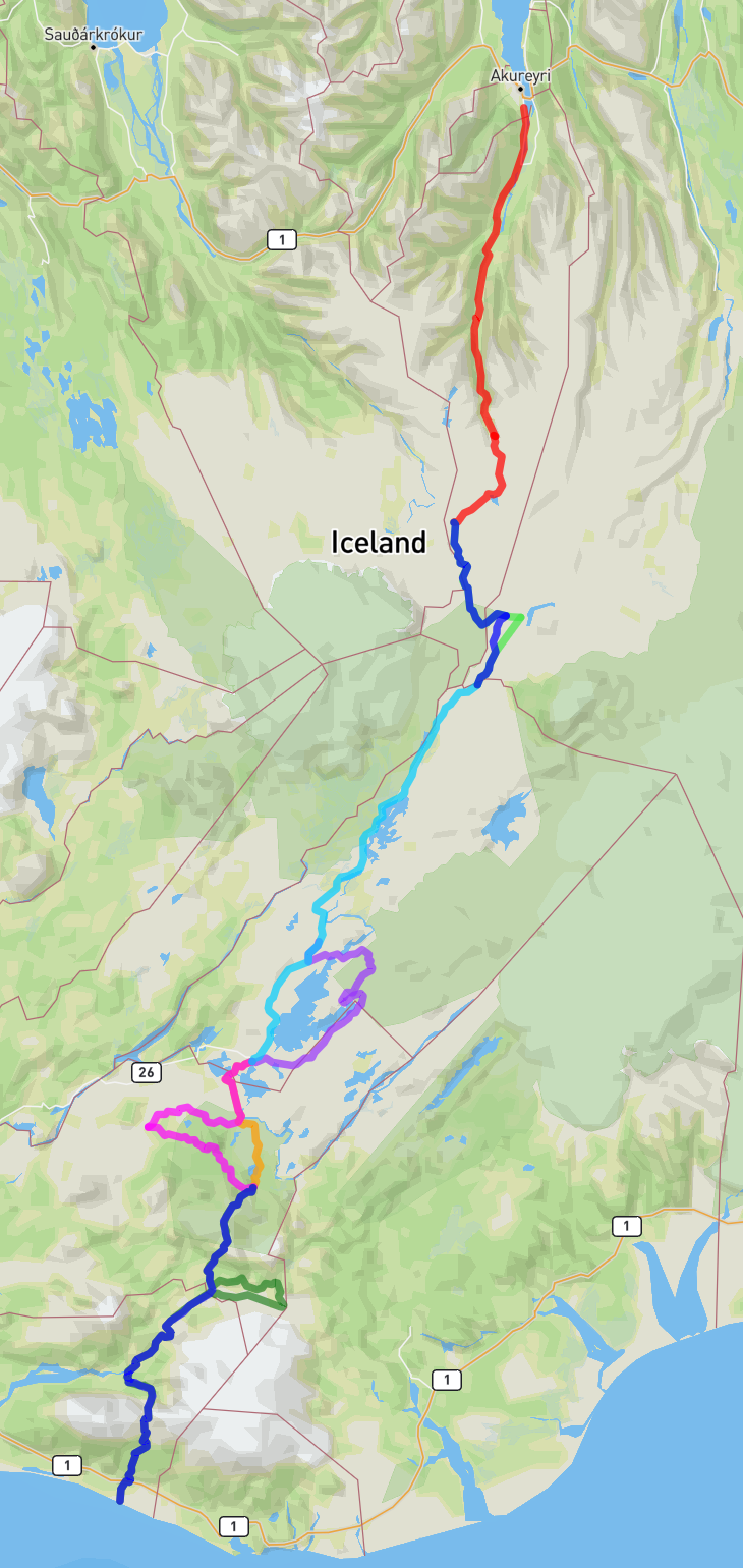 Also wenn du noch Varianten für den Nordteil suchst, würde ich noch anbieten a) von Akureyri über Garðsárdalur, Gönguskarð und Bleiksmýrardalur oder b) von Akureyri über die Bildsárskarð ins Fnjóskadalur und über die Hellugnúpsskarð weiter nach Stóruvellir im Barðardalur. Parallel zur F26 könntest du dich dann mit Hilfe der Atlaskort auf die Suche nach dem alten Reitweg machen...