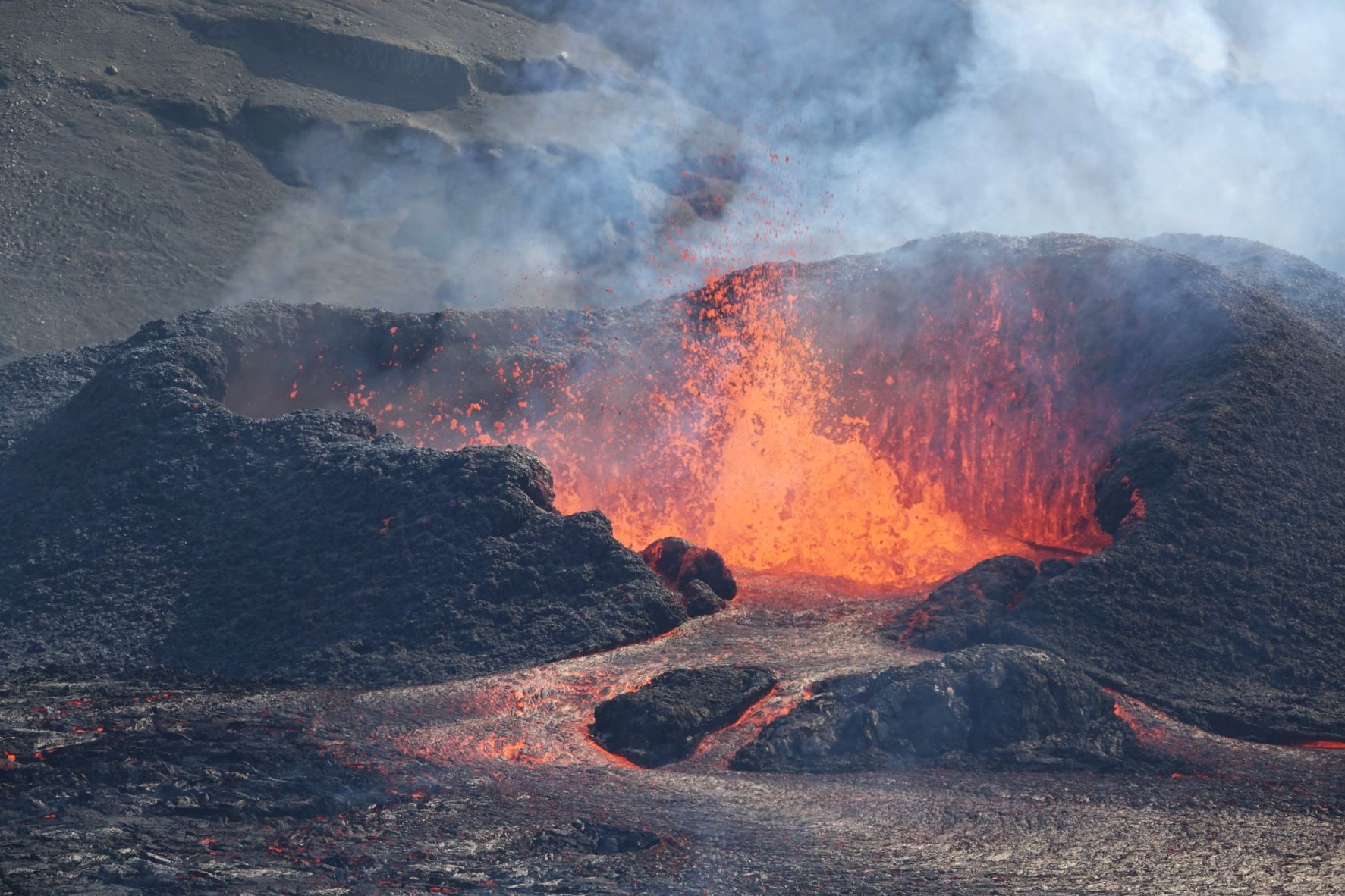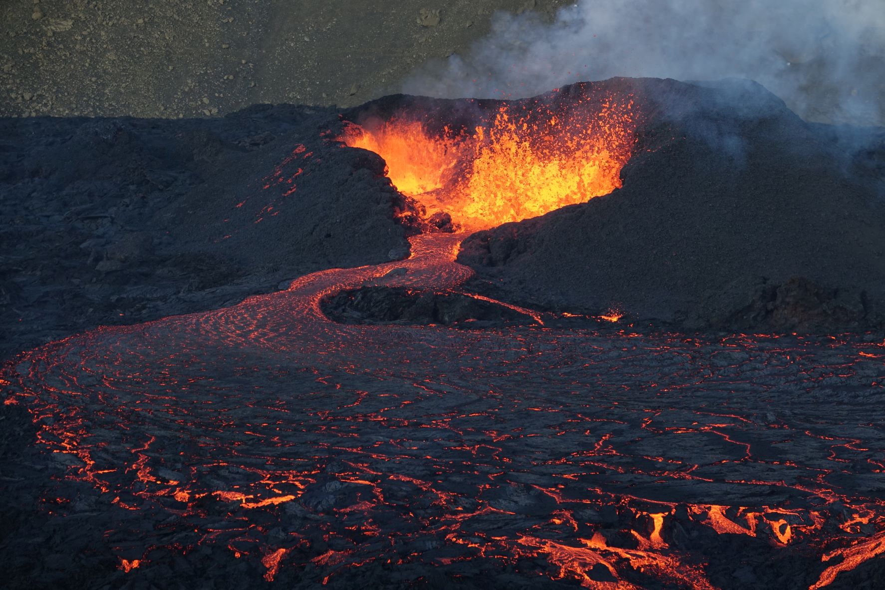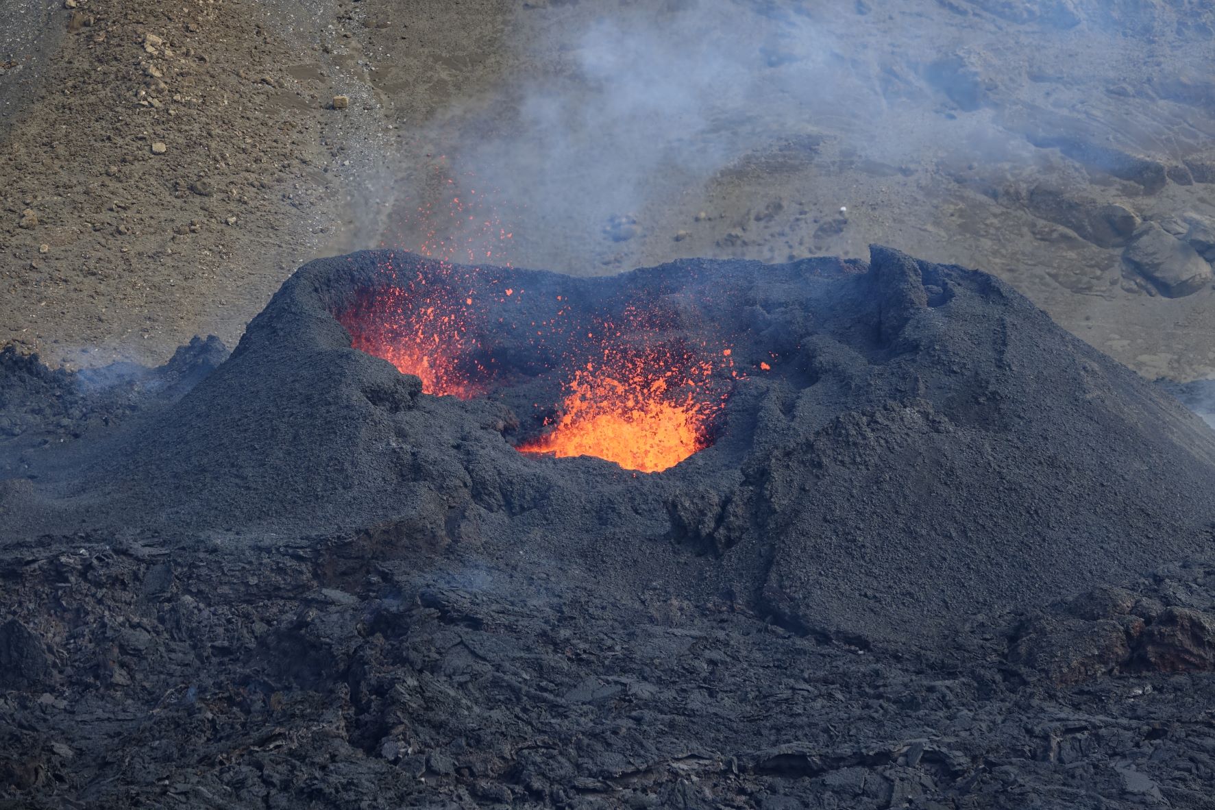 Schon immer noch beeindruckend, aber vor allem der offen fließende Lavastrom fehlt. Man versteht, dass die von links und von rechts guckenden Webcams das Lavagebrodel nicht mehr sehen können. Wie Vaðfuglar aber schreibt, auf den Nachtbildern ist das Leuchten noch zu sehen, dann wird es wohl im Krater immer noch brodeln.