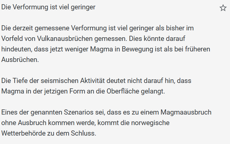 * Man zieht aber auch in Erwägung, dass sich die Aktivität in / unter der Sundnhúker-Kraterreihe verändert. Es wird nicht ausgeschlossen, dass das Magma sich wie bei den Ausbrüchen am Fagradalsfjall verhält: „Dort bahnte sich ein Magmakanal seinen Weg, dann ließ die seismische Aktivität nach und ein paar Tage später brach die Eruption relativ lautlos aus. Aus diesem Grund sind wir weiterhin auf der Hut.“ (siehe hier)