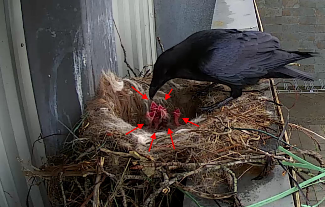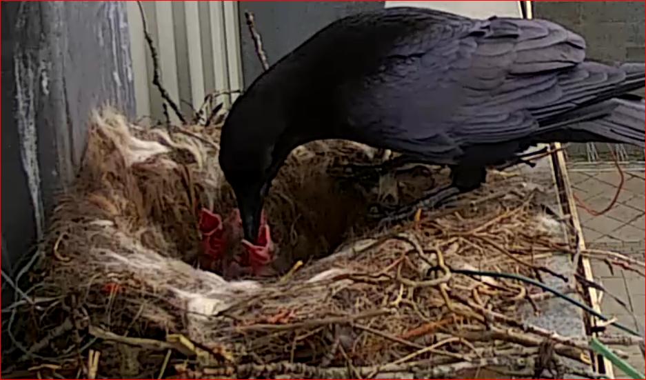 Huuuunger!!Immer mal wieder sind die kleinen Raben allein. Man sieht den atmenden "Haufen", ab und zu streckt einer den Kopf in die Höhe und sperrt den Schnabel auf. Kurzfristig gelingt es schon, den Kopf zu balancieren, bevor er wieder fällt...