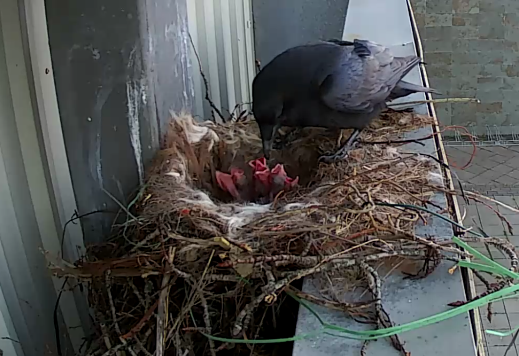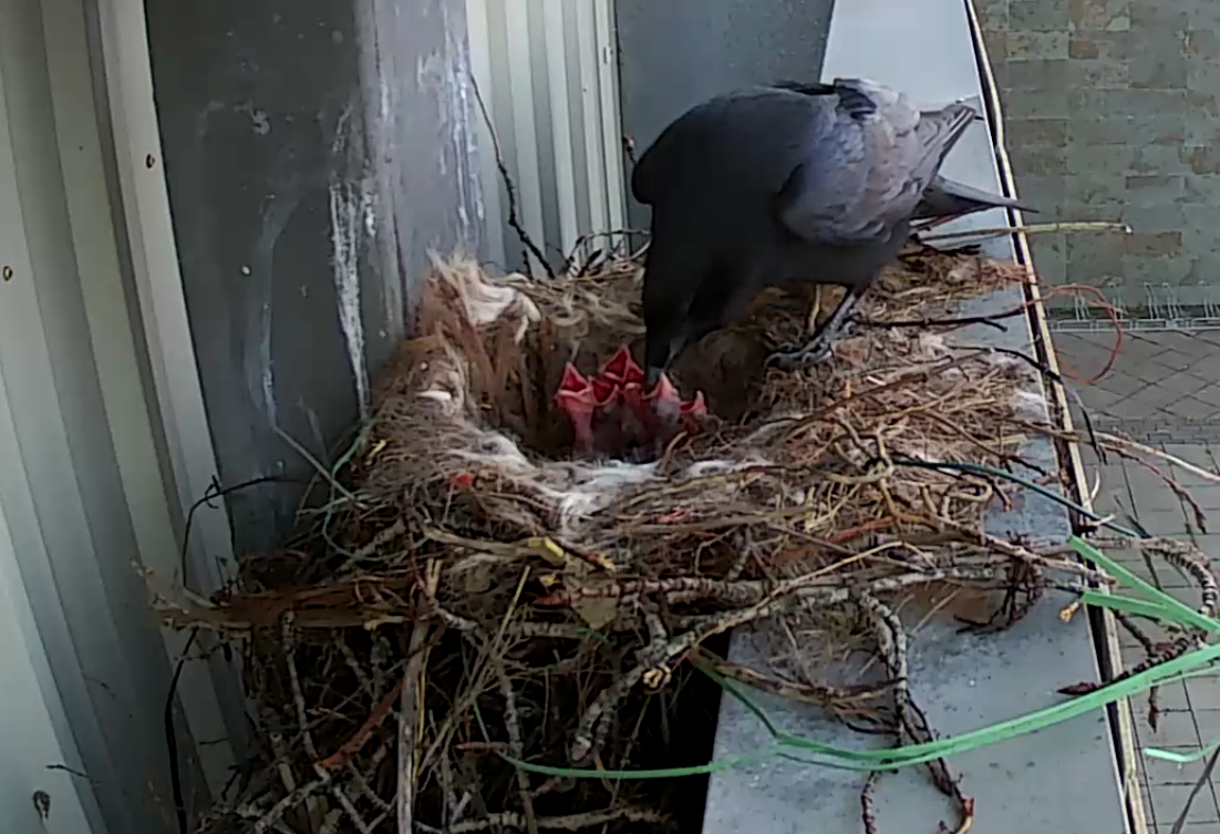 Ich habe seit heute Nachmittag auch 6 gezählt - da haben sie wohl ein richtiges Ü-Ei wochenlang im Nest versteckt Mit Rabe Nr. 5 hatte ich fest gerechnet, Nr. 6 kam ganz unverhofft Leider lässt ich dieser durcheinander wuselnde Rabenhaufen so schlecht als "Gruppenbild" ablichten. Hier kann man die 6 ungefähr erkennen: