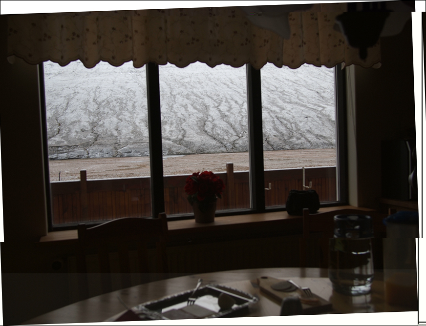 Vom Tisch aus habe ich einen schönen blick auf den Ost-Hang des Hrafnkelsdalurs. Seit gesternabend ist er mit eine sehr dünne Schneeschicht überzogen. Tagsüber taut dies alles meistens auf, bis die nächste grau-weisse Wolke sich leer schüttet und das Spiel wieder von vorne anfängt. Ich geniesse diesen Blick und auch den Komfort und Wärme dieses Hauses.