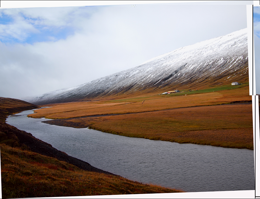 Im Fjallaskarð stehend sehe ich schon die kleine Hütten im Osten liegen und genau da ab diese Hütten scheint es alsob jemand dem Schnee einen halt zugerufen hat. Weiter erstreckt sich dann, mit mehrere Seen beschmückt, eine goldbraune wölbende Hochmoor-fläche, die Fljótsdalsheiði. Trotz windige kälte geniesse ich völlig diesen (Augen-)Blick.