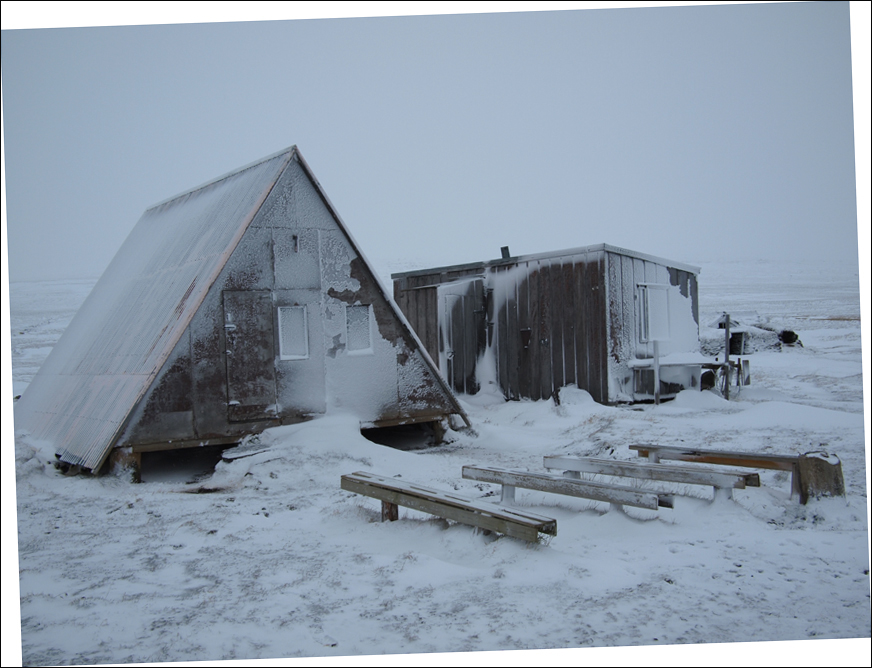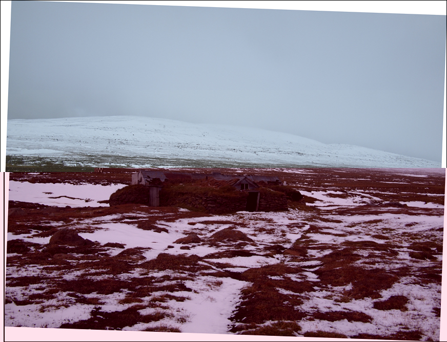 Kurz bevor ich endlich diese Hütten erreiche erwarten mich noch zwei Überraschungen. Die erste Überraschung ist ein wunderschönes, noch ziemlich gut erhaltenes, Torfgebäude gleich neben die kofi's. Die andere Überraschung aber das ich um die Gebäuden zu erreichen noch einmal einen stinkend braunroter, zum teil vereister, Bach furten muss. Mag es nicht mehr, mir ist es mittlerweile kalt geworden, muss aber so sein... Rutsche dann, doofer weisse, am glitschigen Ufer an jenerseite nochmals zurück zum diesen Bach hinein. Na, danke schön !