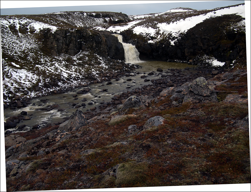 Als ich mich verabschiede schneit es wieder ein wenig. Ich habe schon meine Watschuhe an, die Wandersteifel in der Hand, denn innerhalb von noch keine 10 Minuten darf ich der trage Haubtfluss dieses Tal furten. Laut Aðalbóls eigentümer sollte dies einfach sein. Es stimmt... teilweisse: die Strömung ist nur gering, doch ist der Fluss heute Hüfttief und hohle ich mir eine nasse Hose ein. Kein toller Start, aber selbst schuld. Dannach geht es gleich den schöne farbreiche mit Zwergstrauchheide bewachsener Hang hoch, dies wärmt einer auf. Oben angekommen stosse ich auf einen alte Varða. Vereinzelt sind noch mehr von diese Steinmännchen zu finden als Teil einer alte Route zum Hof Kleif im Fljótsdalur, sie sind aber schlecht sichtbar. Ob es dazu auch noch einen sichtbaren Pfad gibt weiss ich nicht denn der Schnee hält es heute für das Menschenauge verborgen. Was ich aber schnellstens weiss, ist das diese Hochfläche ein riesiges Sumpfgebiet herbergt. Das Moor unter die dünne buckelige Schneedecke saugt unverbitterlich an die Schuhe. Ich versuche die Füsse in sofern trocken zu halten durch von einen Grasbuckel zur anderen zu hüpfen. Es ist aber nicht besonders hilfreich, das mann auch noch vor erreichen der steinigen Eyvindarfjöll, den Hölkná und einen Zufluss davon queren muss. Weit bevor ich mein heutiges Ziel erreiche, die kofi's unterhalb des Fjallaskarð, schlürft es im innenbereich meiner Schuhe genau so Laut als an die Aussenseite davon !