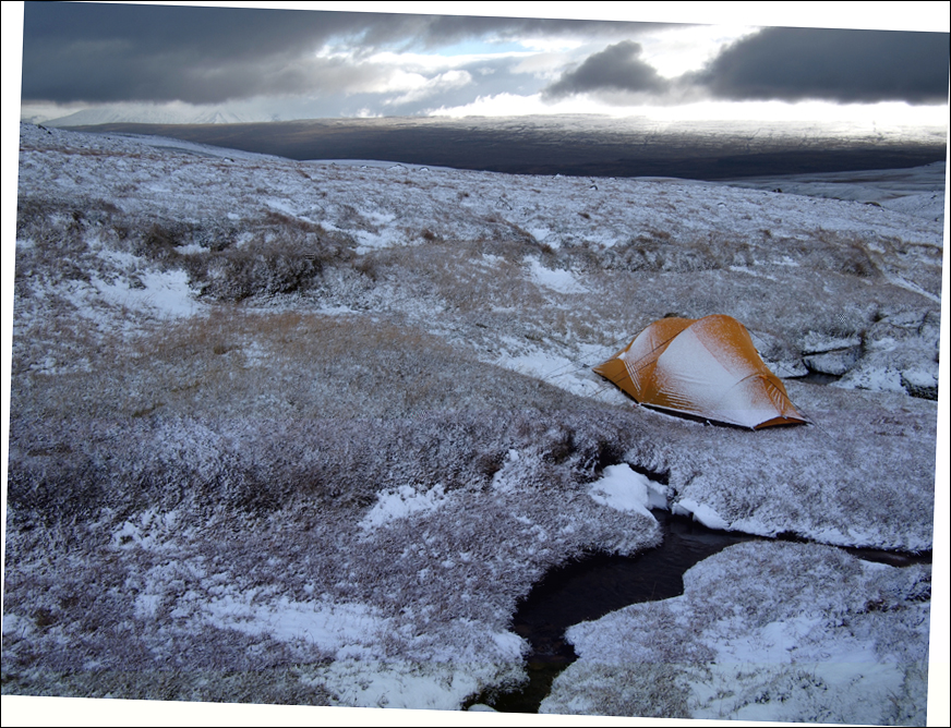 Es bieten sich mehrere gut geschützte Stellen an entlang der Bessastaðaá. Ich Zelte unweit von einen netten Wasserfall in dieser Fluss, die Ufer in Herbststimmung und mit Blick auf die nächste bezuckerte Hochebene. Dahinter erblicke ich sogar einen hauch von die eindrucksvolle beschneite Bergkette dessen mich nur noch von die Fjorden scheidet ! Die Strapazen der letzte Stunde verschwinden schon in der Dämmerung des Abends.