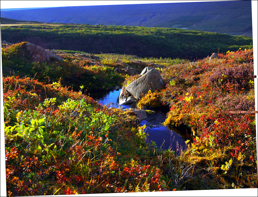 Nun stehe ich am Rande des Ranaskógars, ein sehr schöner ursprünglicher Isländischer Birkenwald. Die Herbstfarben halten sich hier noch im grenzen. Im Nachhinein nicht ganz verwunderlich denn ich bin auf fast Meereshöhe gesunken, nur noch ganze 35 meter höhe über dem Meeresspiegel zeigt meine Uhr an. Nach auch hier, wärment in der Sonne, eine lange Pause gemacht zu haben, suche ich der Anfang des sgn. "Linuvegurs" auf. Auch ein "Souvenir" des Kárahnjúkurs Projekt. Ich ziehe wieder langsam hoch über die Schotterpiste am südlichen Ende des Hallormsstaðaskógurs. Ich laufe zwischen eine mix aus Laub- und Nadelbäumen durch, bis ich auf etwa 300 meter die Baumgrenze erreicht habe und Zelte hier. Finde mehrfach überraschend die noch blühende "Bláklukkan", noch ein Markenzeichen für den Osten Islands. Einen Bach platschert einen Felsen hinunter, Vögel zwitschern im Wald, es ist fast Windstill und angenehme 10-grad Celcius im PLUS bereich. Was für einen kontrast mit heute morgen und die vergangene Tagen !