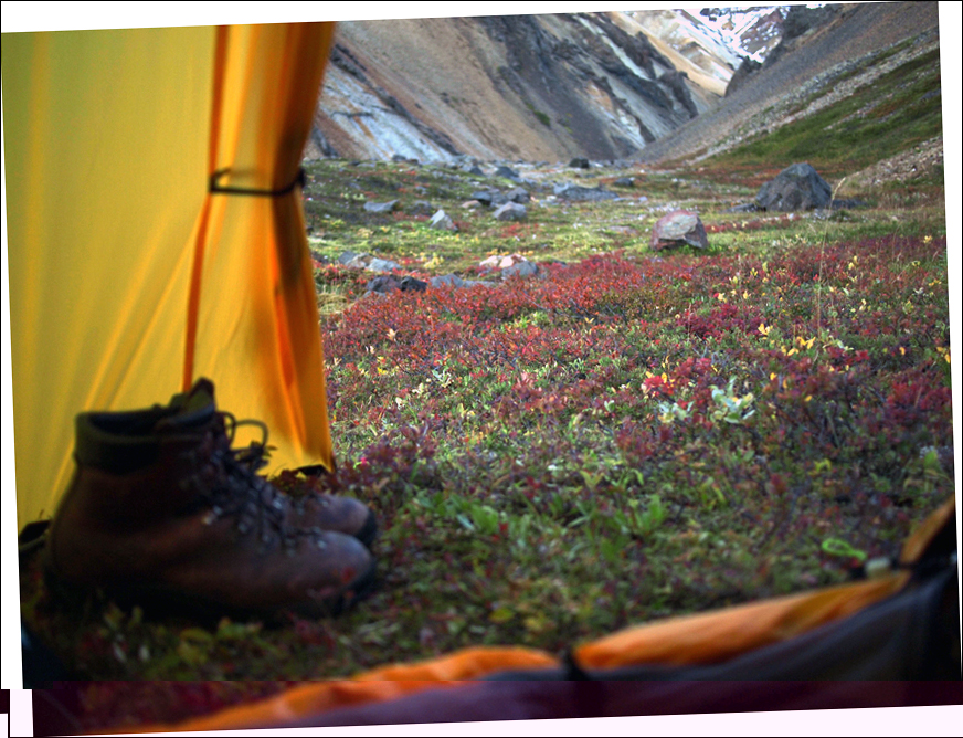 Heute abend 3-gängen Menu: Ich sammle nochmal Blaubeeren und geniesse dieses Seitental wo in ich Zelte. Es ist bunt vom vulkanischen Ursprung und bunt vom Herbst.