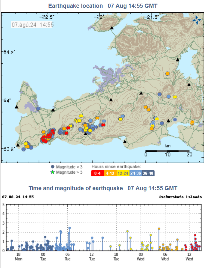 In diesem Artikel heißt es, man erwarte den Ausbruch jeden Moment. Wir sind gespannt. Auch bezüglich des möglichen Ausbruchsortes. Es ist zuletzt immer wieder auch die Möglichkeit erwähnt worden, dass sich eine Spalte innerhalb Grindavíks auftun (wenn auch nicht initial) oder Lava durch bestehende Spalten in das Stadtgebiet gelangen könnte. Als am wahrscheinlichsten gilt aber ein Ausbruch an bekannter Stelle (Nähe letzter Ausbruch vom 29. Mai).