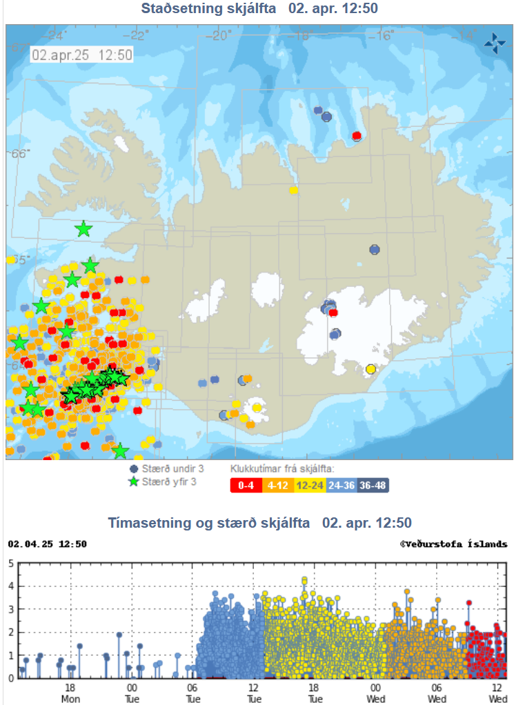 Das Wetteramt geht davon aus, dass ein inzwischen ca. 11 km langer Magmatunnel sich weiter gen Nordosten ausbreitet. Andere sehen das anders. Habe da z. B. gerade diesen Artikel entdeckt: https://www.mbl.is/frettir/innlent/2025 ... stofunnar/.