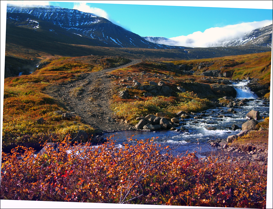 Eine kleine Informationtafel steht am Anfang (und Ende) vom alten Handelsweg über die Eskifjarðarheiði, heute einen markierter Wanderweg. Wobei "Weg" nun das falsche Wort ist, denn dieser Weg oder Pfad gleicht heute teilweisse einen Bach. Die Landschaft ist gesättigt von (zu) viel Regenwasser, sie saugt nichts mehr auf. Ich bin froh da über das mich, laut tekst auf der Info.-tafel, zwei Brücken über die Slenja bzw. Tungudalsá trocken Fusses bringen. Beide Flüsse sehen nun ziemlich heftig aus.