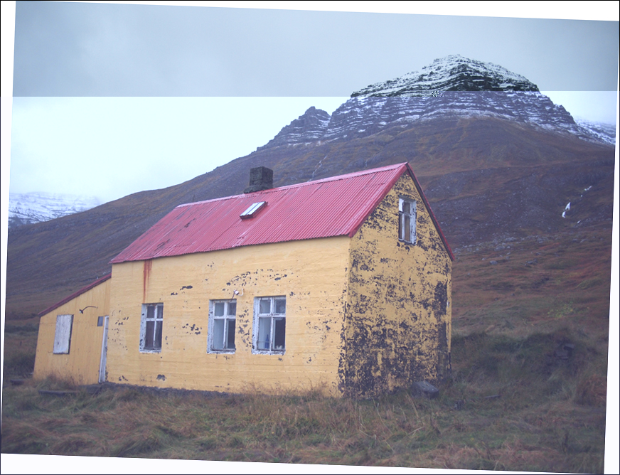 An mächtig grossen, dunkeln, schief gekippten Basaltfelsen geht es vorbei, genau wie es sonst wo in die Ostfjorden üblich ist. Die Sonne kämpft sich einen Weg durch die Bewölkung, scheint auf das alte Spukhaus im Viðfjörður. Früher eine Gaststätte, als die Strasse über den Oddskarð noch nicht angelegt war, heutzutage ist das Haus schön renoviert. Es funkelt in der Sonne in die Tiefe des Fjords. Weit dahinter reflektiert die Sonne auch auf das weis vom Barðnes-haus.