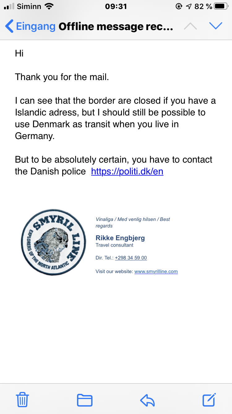 Etwas anderes können sie aber nicht sinnvoll machen, als an die örtlichen Behörden zu verweisen.Ruthw hat geschrieben: So 27. Sep 2020, 05:13 Da macht Smyril Line es sich schon etwas einfach: ‚Should be‘ statt ‚is‘ und um sicher zu sein soll der Passagier sich bei der dänischen Polizei informieren......