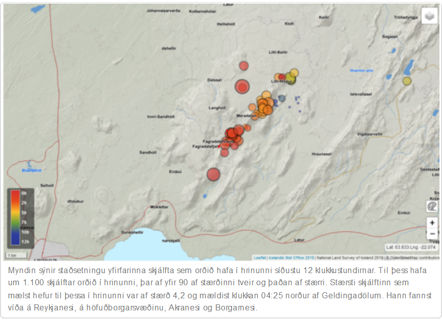 Ein heftiges Erdbeben gab es heute Nacht um 4.24 Uhr rund 2 km nordöstlich des Fagradalsfjall. Nach den Informationen des meteorologischen Instituts (Veðurstofa) hatte das Beben eine Stärke von 4,2. Das Beben wurde weithin gefühlt auf Reykjanes, im Hauptstadtgebiet, Akranes und Borganes.
