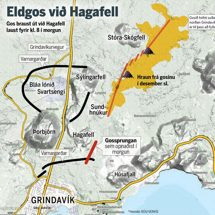 "Benedikt Ófeigsson, Geophysiker beim Isländischen Meteorologischen Amt, sagt, der Ausbruch ereigne sich südlich von Hagafell, am südlichsten Teil der Sunhnúka-Kraterreihe. Der Ausbruch ist viel kleiner als der letzte Ausbruch und lässt darauf schließen, dass sich die Spalte unter Druck voraussichtlich ausdehnen wird. Reduzieren Sie dies dann und es werden zwei bis drei aktive Krater sein. Er sagt, dass es den Anschein hat, dass sich der Ausbruch in Richtung von Grindavík ausbreitet." (https://www.ruv.is/frettir/innlent/2024 ... nna-401853, google translate)