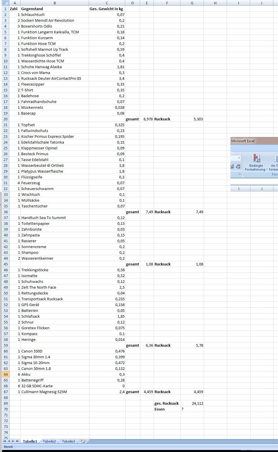 Zu den Gewichtsangaben: Das meiste steht ja bei Globetrotter - was nicht da stand, habe ich einfach mal geschätzt. Und bei meiner Kameraausrüstung hat es mich wirklich mal interessiert, wie viel das alles wiegt.