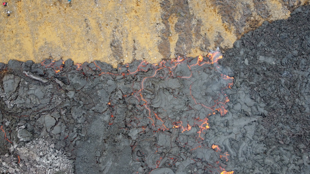 Luftbild von der Lava, die den Rand vom Berg mit den Besuchern erreicht.