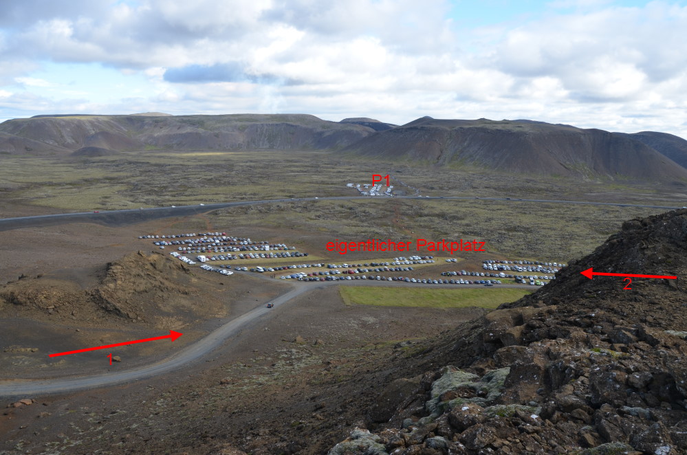 Der grosse Parkplatz hat zwei Zugänge. Einen, ich nenn den Mal 1, von Westen aus und einen zweiten 2 von Osten aus. Für das Bild bin ich auf den nahen Berg geklettert, Drohne wär schlauer gewesen.