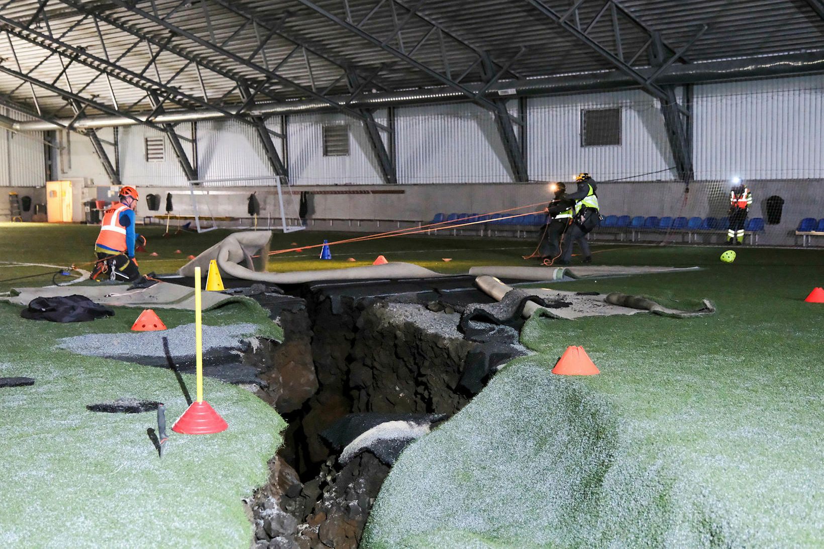 In Grindavík ist derweil unter einer Halle unter dem Kunstrasen ein ca. 9 m tiefer Spalt entdeckt worden.