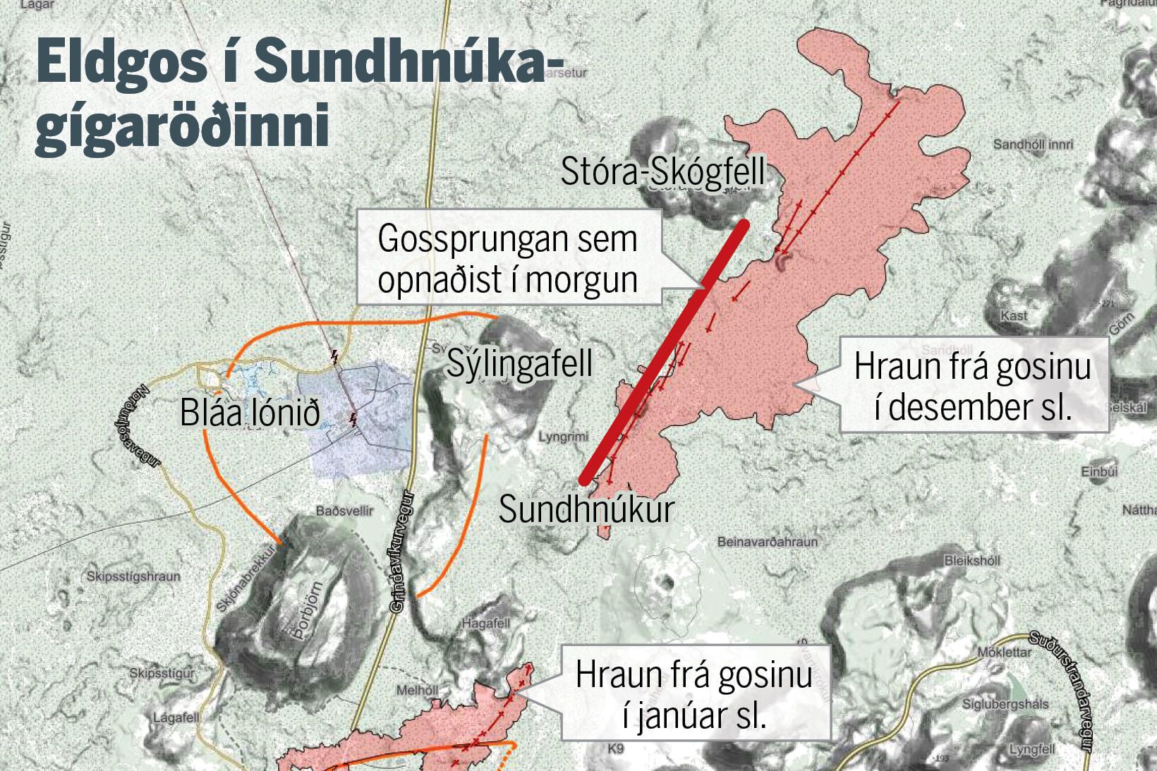 Der Ausbruch findet dort statt, wo es auch ab 18. Dez einen Ausbruch gab. "Der Riss ist etwa 3 km lang und verläuft von Sundhnúk im Süden bis zum östlichen Ende von Stóra-Scógfell. " (https://vedur.is/um-vi/frettir/jardskja ... fst-i-nott)